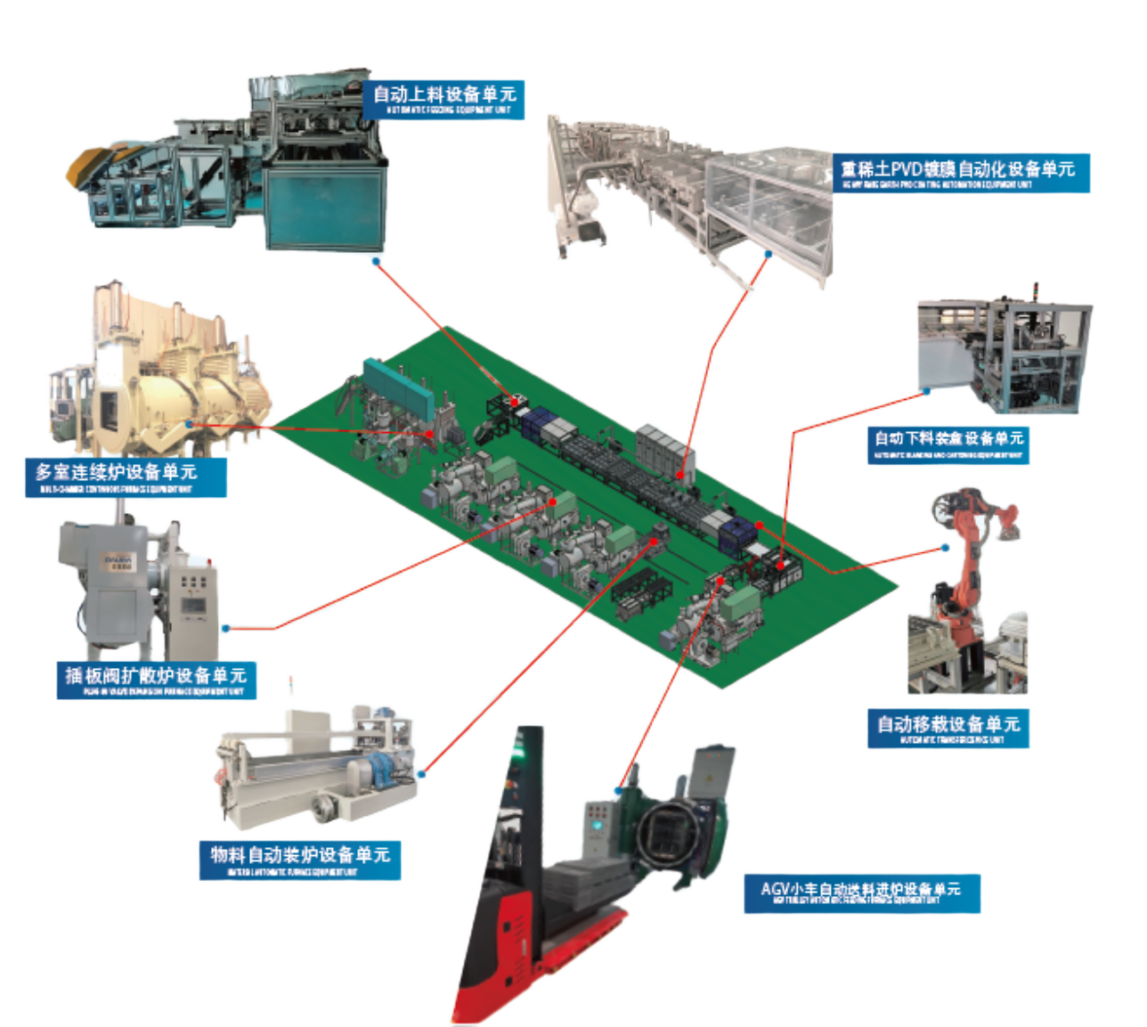 钕铁硼从开始上料到镀膜、下料、移载到扩散工艺全程自动运行。