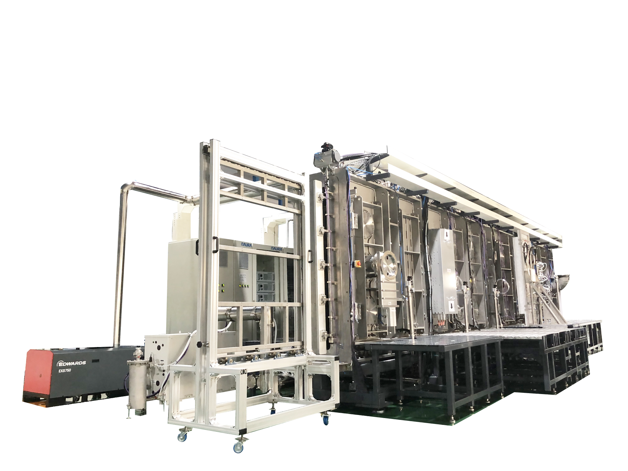 FLVP系列产品阴极均竖直安装,产品装夹在载板上从阴极处连续通过。设备由多组模块化真空腔室组成,腔室内可配置铠装或红外加热、阳极层离子源或弧光离子源、直流溅射磁控阴极、反应溅射磁控阴极、阴极电弧等不同技术部件,实现金属、金属化合物以及碳系涂层的制备。