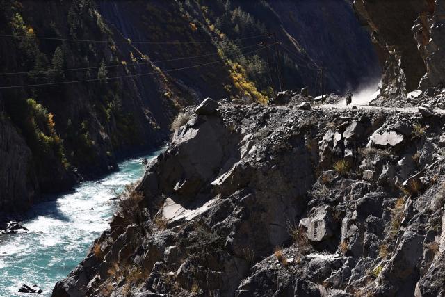 With the roads in this area of India flip-flopping from Tarmac to dirt to rubble to mud, we have already ridden our fair share of rough stuff on the new bike. Now though, at the halfway point we get our first proper taste of it on a four-mile stretch that runs along and above the Chenab River. It’s a good job this isn’t my first taste of the Himmy off-road, as the road is a treacherous balcony road seemingly clinging to a cliff and sometimes with rock walls looming ominously overhead. The Himalayan though is taking it all in its stride.