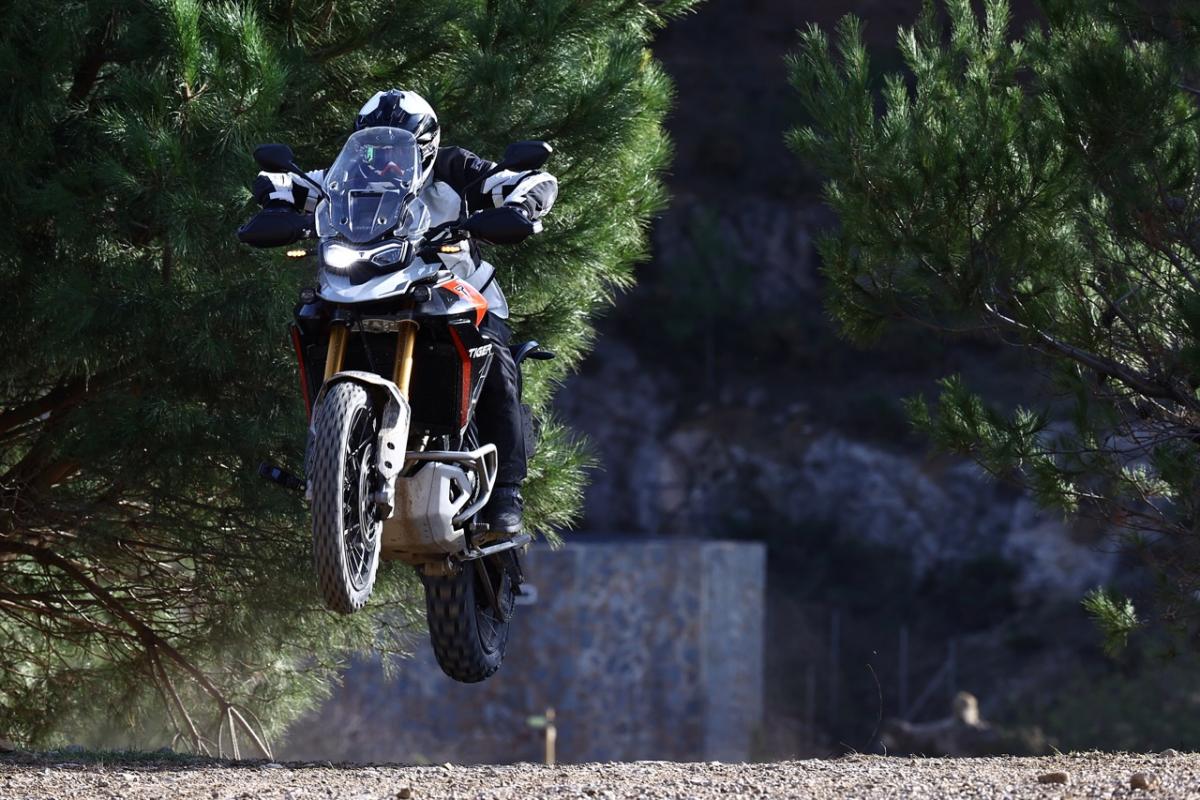 The suspension is also nicely set up, and while some might be wanting a sexy Swedish name on the fork tubes, I’m not sure it’d add anything to the experience. It’s fully adjustable for a start, and you have a lovely, progressive plushness in the front end that allows you to drive into the stroke of the fork by an inch or two, forcing the tyre into the dirt, sharpening up the front end and helping to manufacture some grip from the tyre. We even got to sample some jumps on the bike, and I can confirm that Tigger does indeed like to bounce! At the main adventure experience HQ, there is an expansive plateau, with fairly sizable climbs that lead up to the top. Hit one of these in first or second gear and the Tiger will not only fly but land in a controlled and almost graceful manner. It’s not something many riders will actually do with their Tiger, but like owning the watch that went to the moon, it’s nice to know that it can!