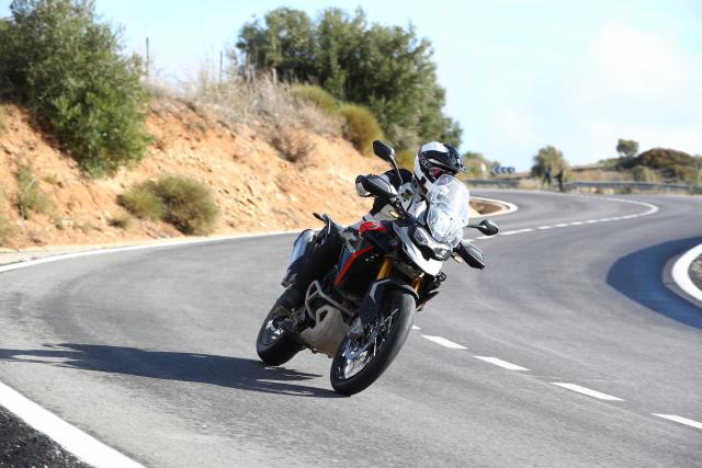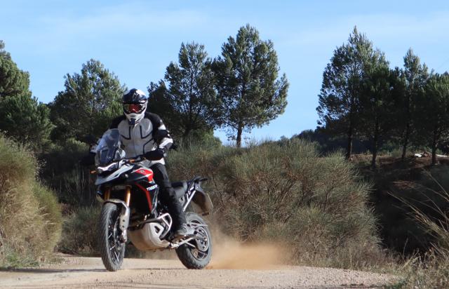 It’s not the full and fancy semi-active system at both ends, as found on the bigger Tiger 1200s, but instead an electronically adjusted rear shock absorber, and on a bike like this it makes a lot of sense. The front and rear suspension on all bikes in the range is from Marzocchi, and on the GT Pro you’ve got 45mm fully adjustable USD forks and the aforementioned rear shock which features adjustable preload and rebound damping. 180mm of travel at the front and 170mm at the rear sounds like quite a lot, but the set up of the suspension seems bang on for this sort of riding. It’s got a bit of give on the brakes, and you can feel it pitch forward, but it doesn’t feel wayward or like it’s getting away from you. Should you need to chuck another person on the back, or stack it high with luggage, you are also then saved the hassle of cracking out the C-spanner, and instead just a few clicks of the five way joystick will have you set for either solo riding, rider-and-pillion, or fully loaded - both a pillion and luggage.