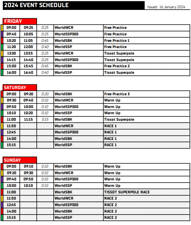 Perhaps the most significant change, though, is that Superpole for all classes bar WorldSBK - meaning WorldWCR, WorldSSP, and WorldSSP300 - will take place on Friday, rather than Saturday, and each of the support categories will get only a 10-minute warm-up session on Saturday morning before their respective races. Unlike MotoGP, which discarded warm-up sessions on Sunday mornings last year for the Moto3 and Moto2 classes, the support classes in WorldSBK retain a 10-minute warm-up on Sunday in 2024.