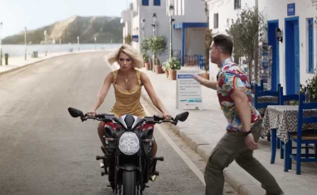 The bike features courtesy of pop starlet Dua Lipa, who can be seen astride the bike while firing a semi-automatic machine pistol (because Hollywood), and then again after being unceremoniously scooped from the machine by wrestling superstar John Cena.