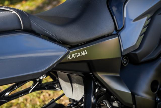 Partly thanks to a fairly short and very tidy tail (the number plate and rear lights are attached to a swingarm-mounted mudguard), and a low nose, the Katana gives off a short and stocky kind of vibe. The Katana logo on the fairing - featuring a sword over the kanji for ‘katana’ - is a nice touch.