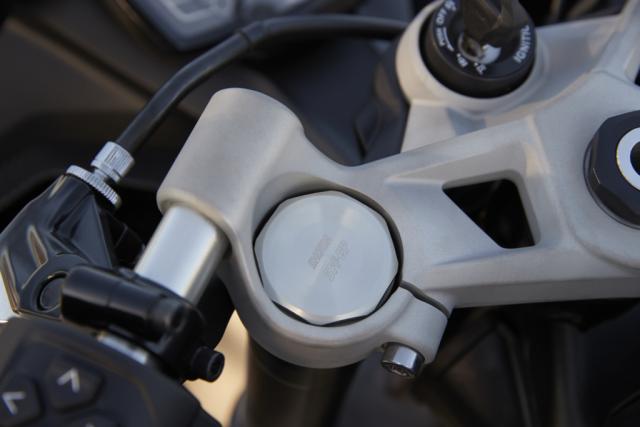 Braking on the bike is taken care of by four-pot radially-mounted calipers at the front which act upon 310mm floating discs and a two-piston sliding caliper with a 210mm disc at the rear. The brakes are Triumph branded and developed by “a leading braking manufacturer” for the bike, although when asked, Triumph declined to say which particular firm. The ABS on the bike is a standard two-channel system, meaning no fancy IMU control for either the ABS or traction control.