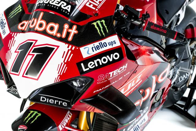 Aruba.it Racing’s bikes in 2024 look more or less the same as last year, with the continuation of the deeper red shade that appeared last year. One notable addition is that of Monster Energy, which became an official partner of Ducati’s factory MotoGP team in 2023, and makes its way onto the WorldSBK team this year, too.